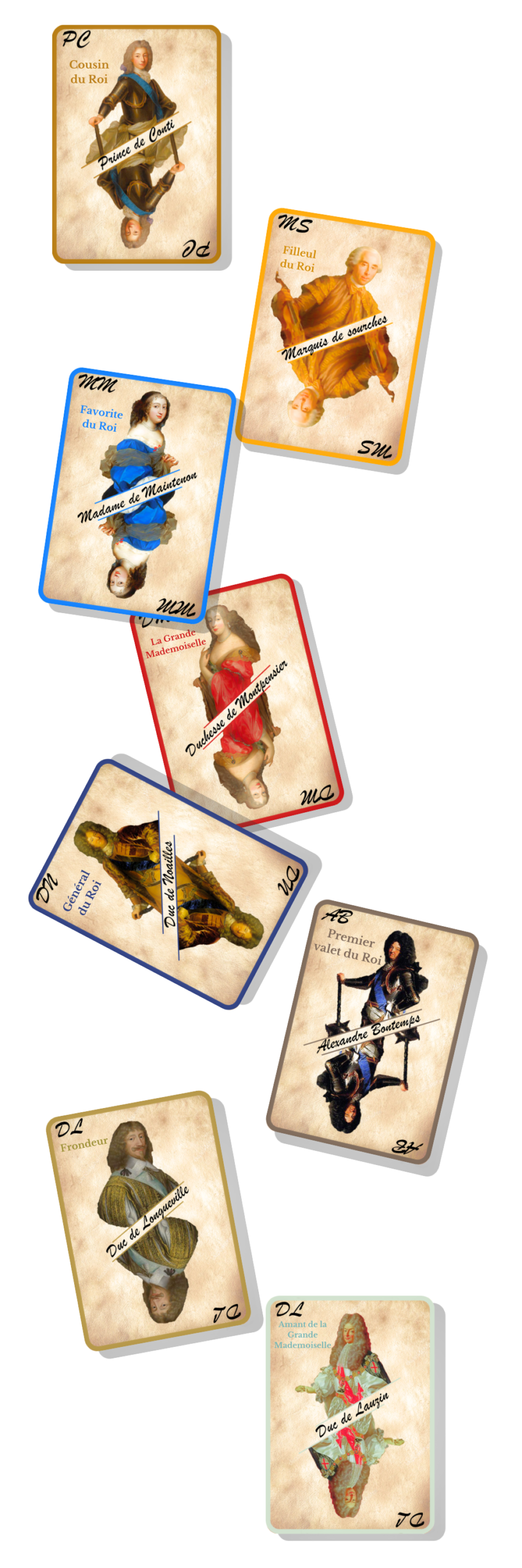 Le Prince de Conti, Antonin de Lauzun, la Grande Mademoiselle, Madame de Maintenon, le Duc de Noailles, le marquis de Sourches, le Duc de Longueville, et Alexandre Bontemps.